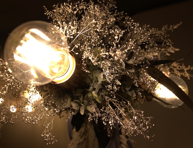 アンティークな雰囲気漂う中型6灯タイプのシャンデリア。 カスミソウによるユニークなフォルムが美しく、中心にあるアジサイと無造作に垂れ下がるツルにより儚い雰囲気に。 灯りをともすとゴールドに輝きます。 【商品について】 ・chandelier : 6灯 ・flower :カスミソウ, アジサイ ・取付け:シーリングプラグ ・size : 直径50cm×高さ60cm×全長135cm(チェーン長さ75cm) ・記載金額にはフラワーシャンデリア、LED電球(個数分)、送料が含まれます(北海道/沖縄/離島のみ別途送料5,500円を頂戴致します) ・購入前に「ATTENTION」または「購入前のご案内・ご注意」をクリックし、ページをご覧頂きご注文ください。ご注文時点で確認頂いていると判断させて頂きますので予めご了承下さい。 ※発送はご入金後から10日以内とさせていただきます。