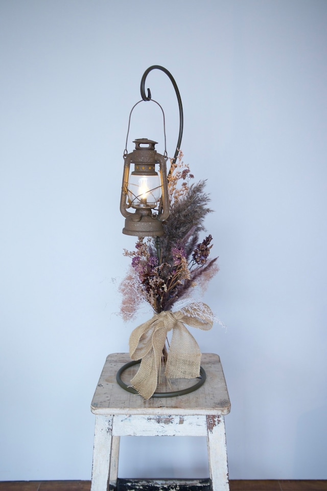 ストレチアリーフやテールリードを用いたフック型のランプ。 吊り下がったランプと花束のようなフォルムが特徴的で、アンティークな雰囲気漂います。 乾電池を使用して点灯する為、コードレスで飾りやすく、ギフトにも最適です。 【商品について】 ・chandelier : 1灯(電池式) ・flower :ストレチアリーフ, ヤマシダ, テールリード ・size : 直径35cm×高さ90cm ・記載金額にはフラワーシャンデリア、LED電球(個数分)、送料が含まれます(北海道/沖縄/離島のみ別途送料5,500円を頂戴致します) ・購入前に「購入前のご案内・ご注意」のページ(https://stockroomMie.theshop.jp/p/00008)をご覧頂きご注文ください。ご注文時点で確認頂いていると判断させて頂きますので予めご了承下さい ※発送はご入金後から10日以内とさせていただきます。