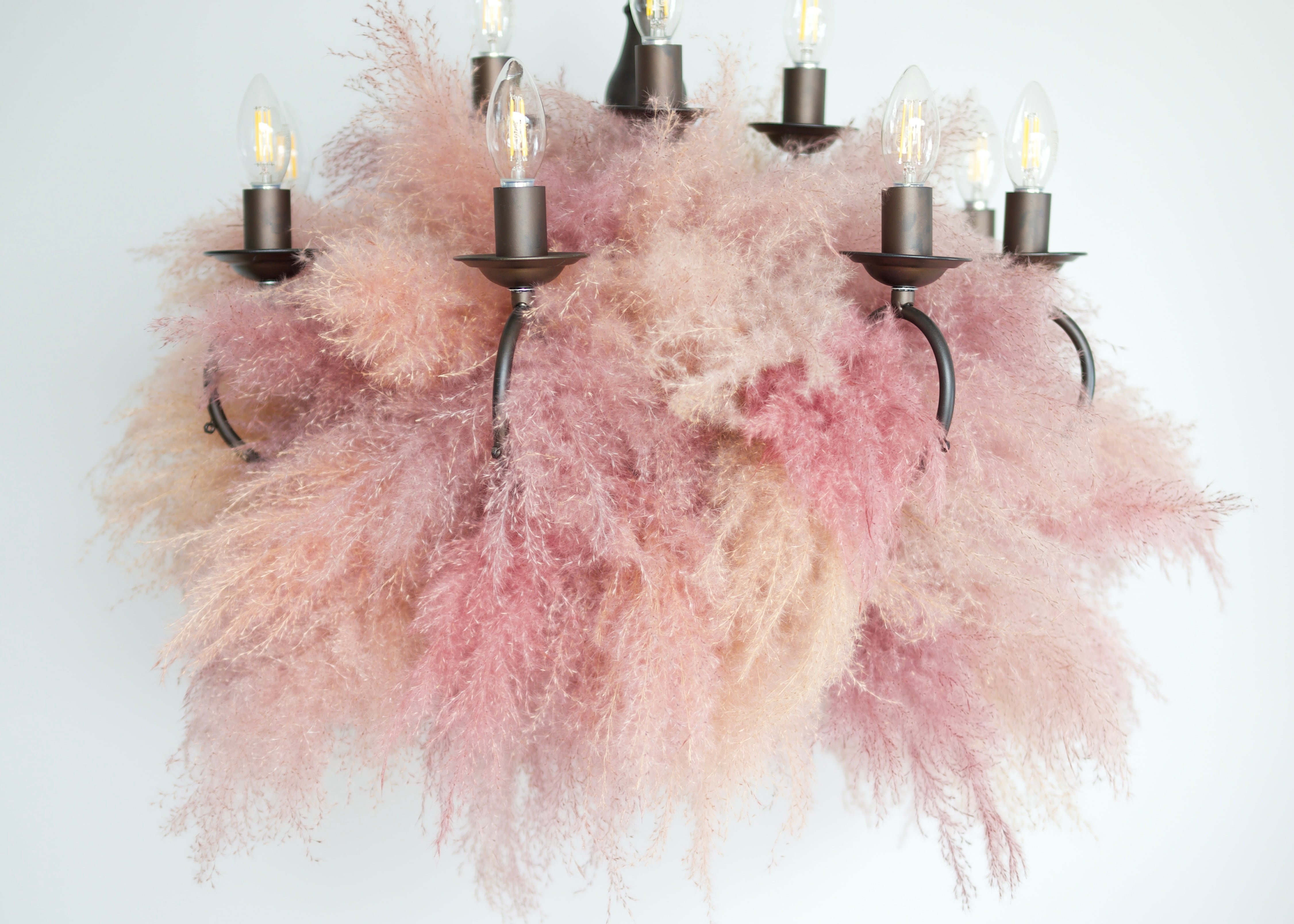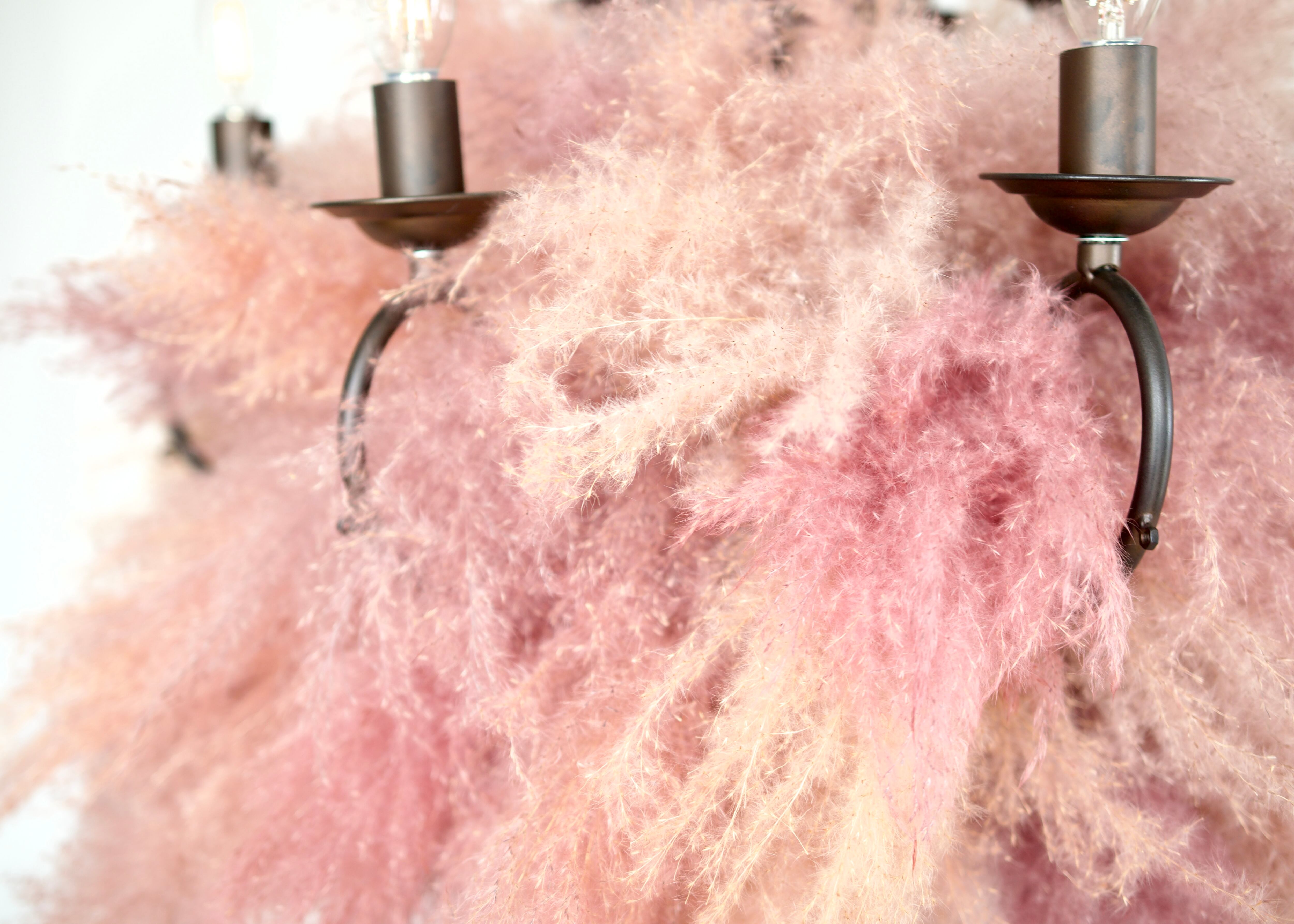 一際目を引くピンクのビッグテールリードを惜しみなく使用した大型12灯サイズのシャンデリア。下段に8灯、上段に4灯の電球が取り付けられております。