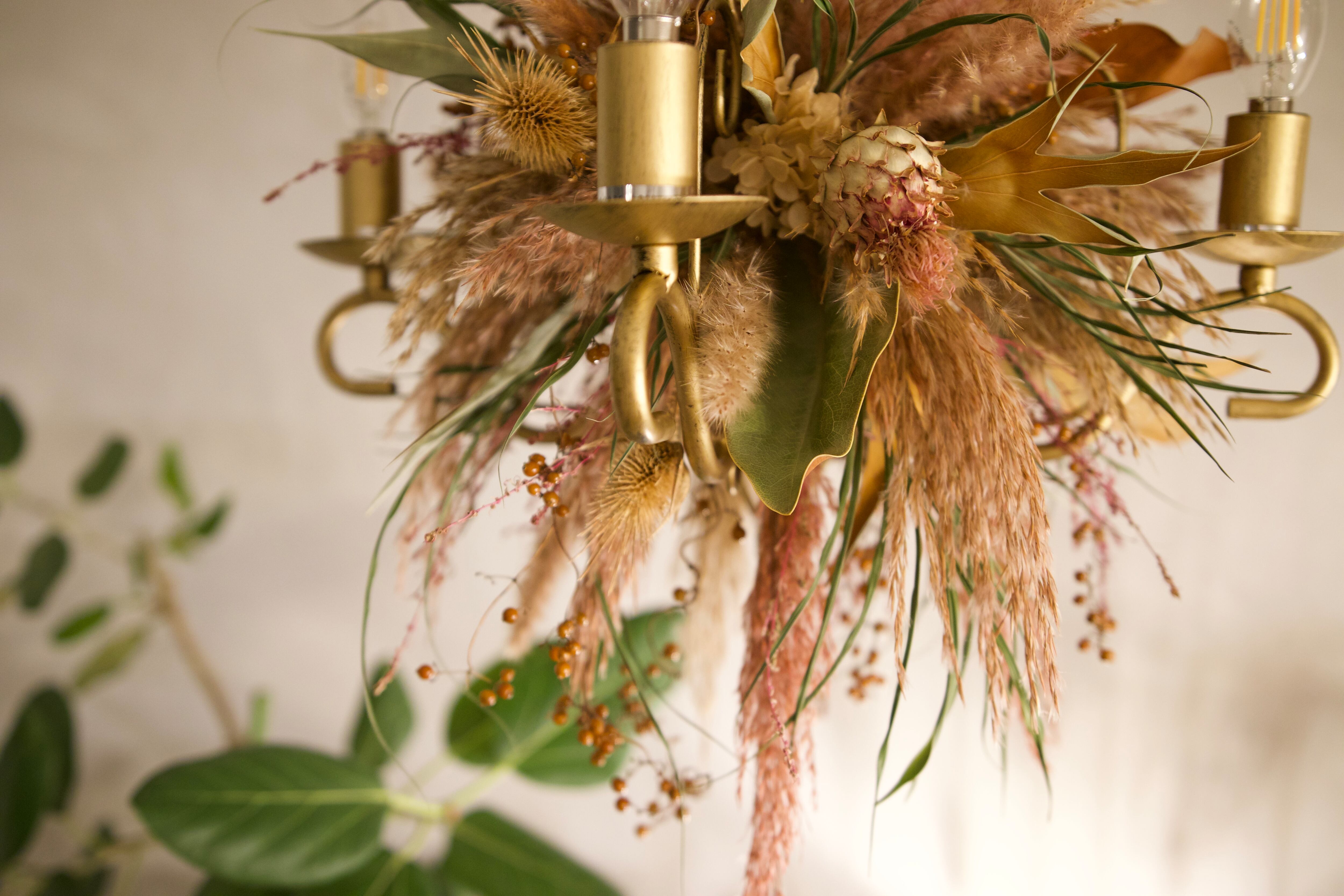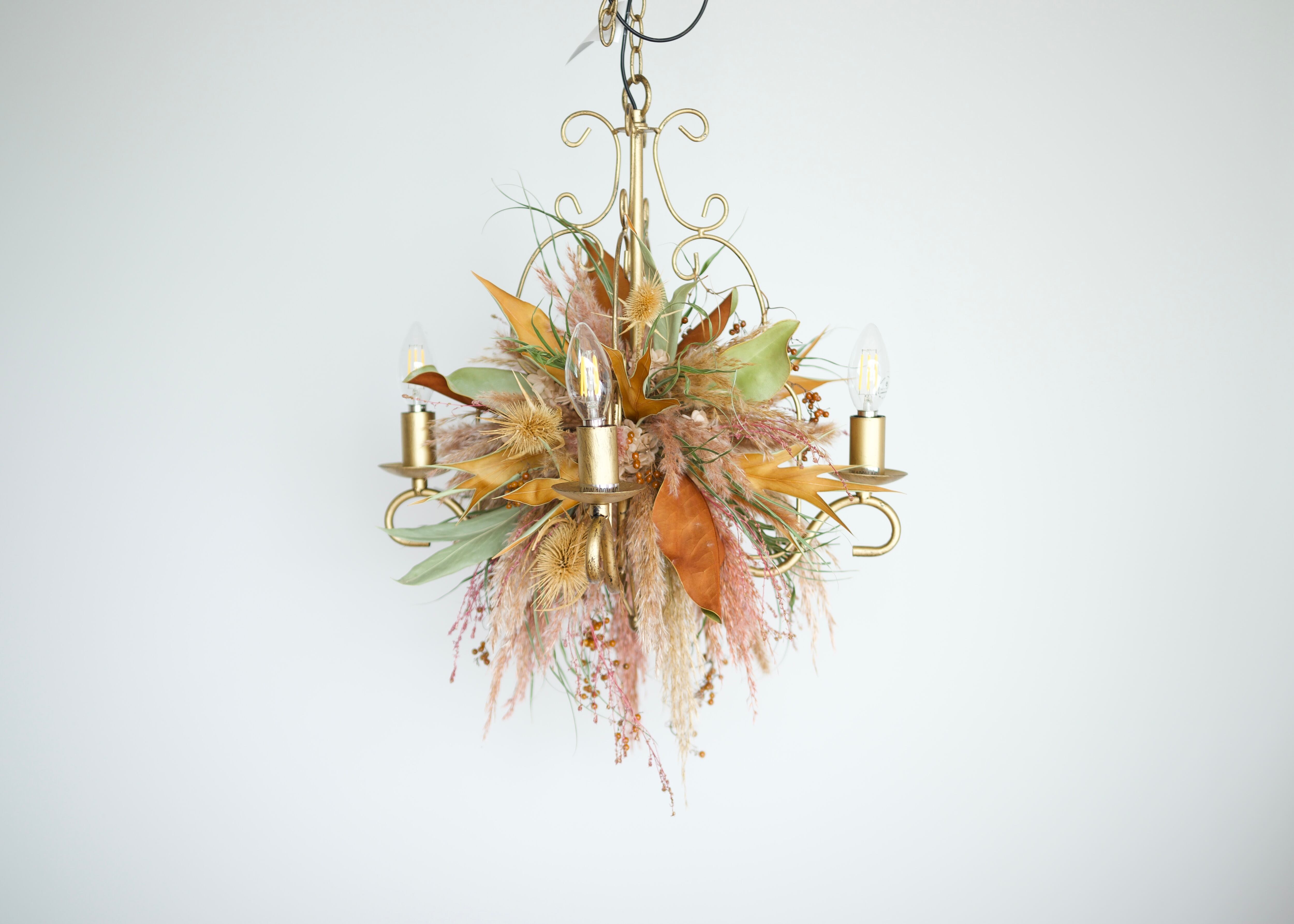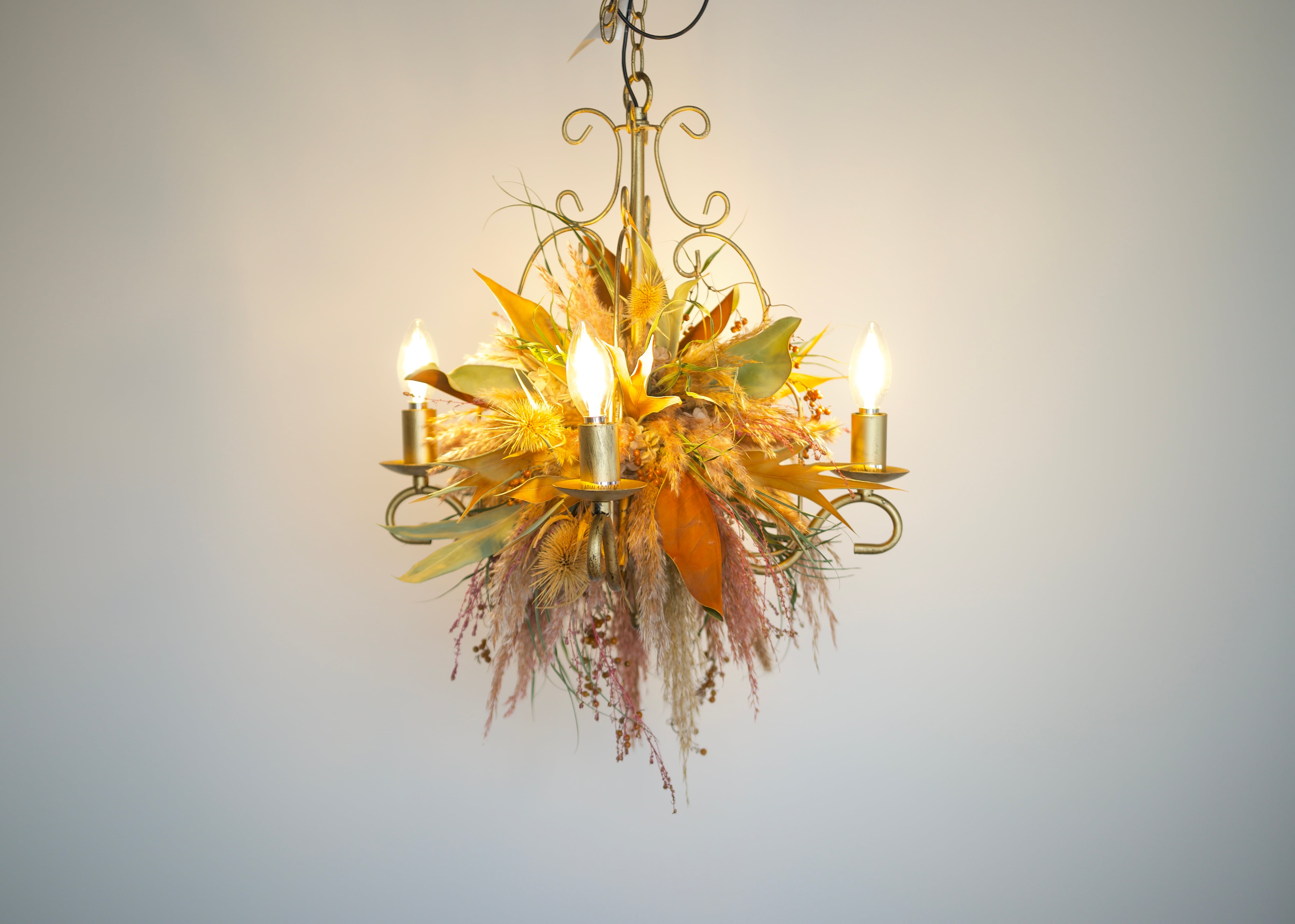 アンティークなデザインのシャンデリアに、色とりどりの花材が組み合わさったインパクトのある1点です。