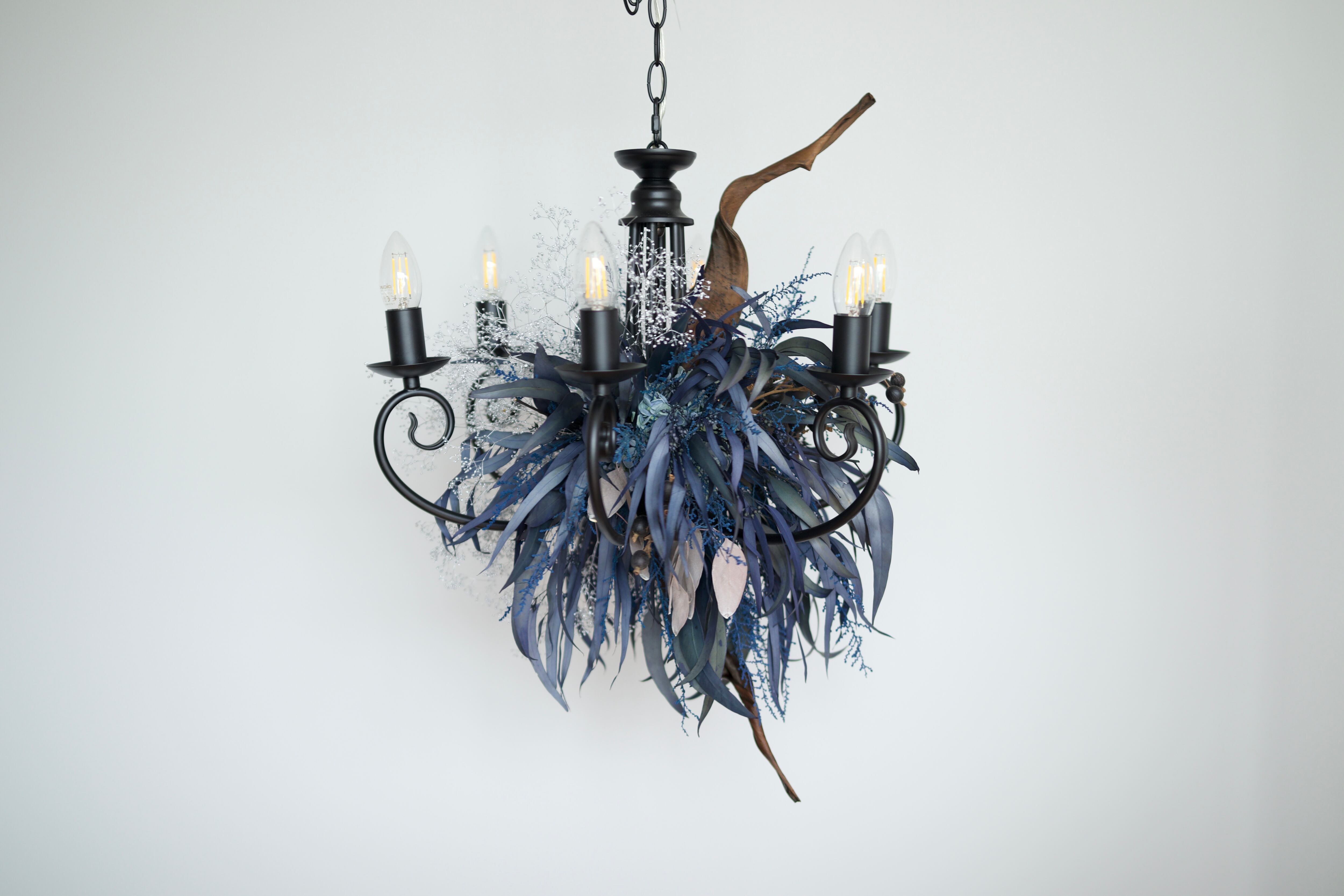 中型シャンデリア6灯 | ストレチアリーフ, ウイロユーカリ, カスミソウ