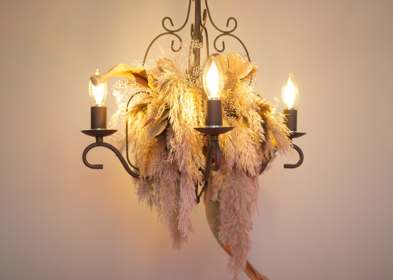 中型シャンデリア4灯 | プルームリード, ストレチアリーフ, カスミソウ