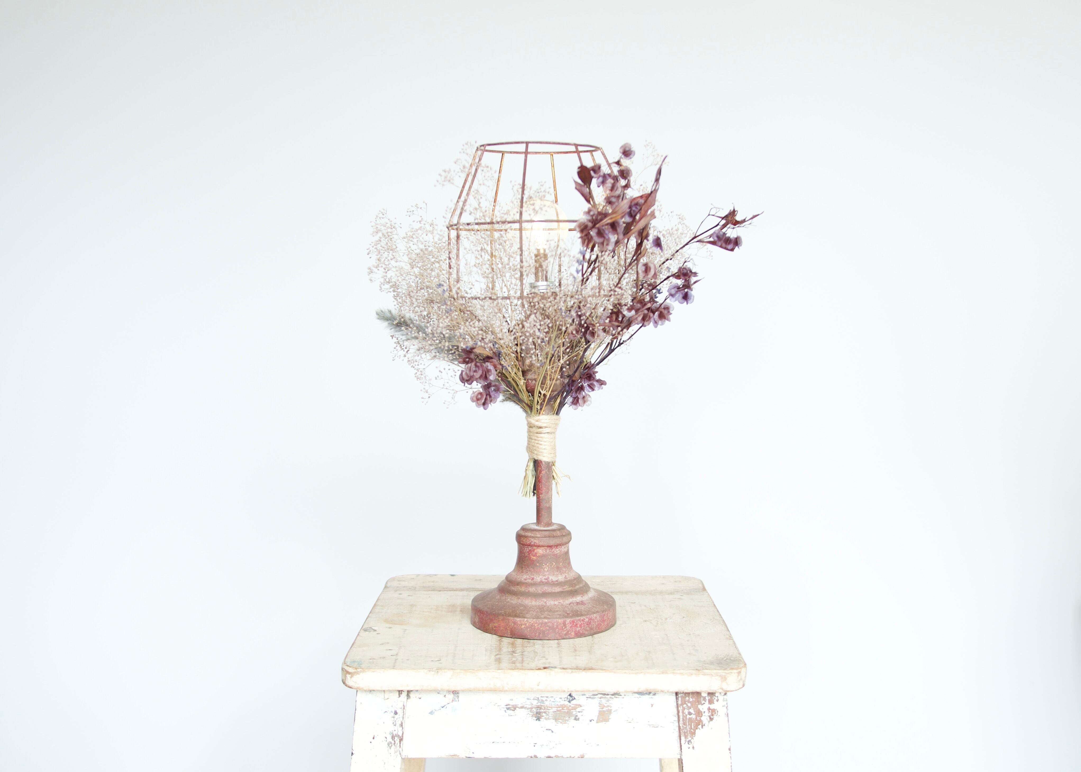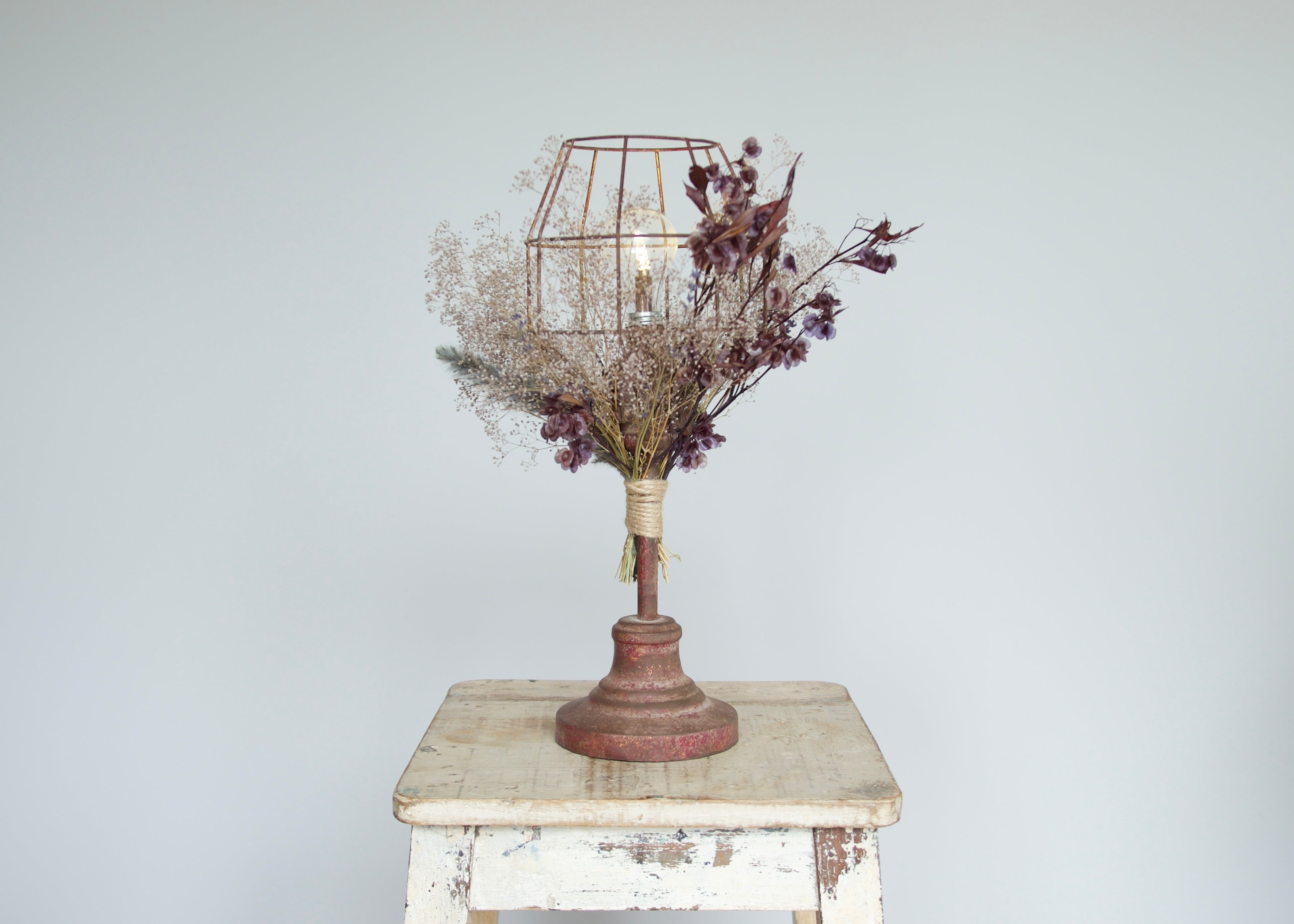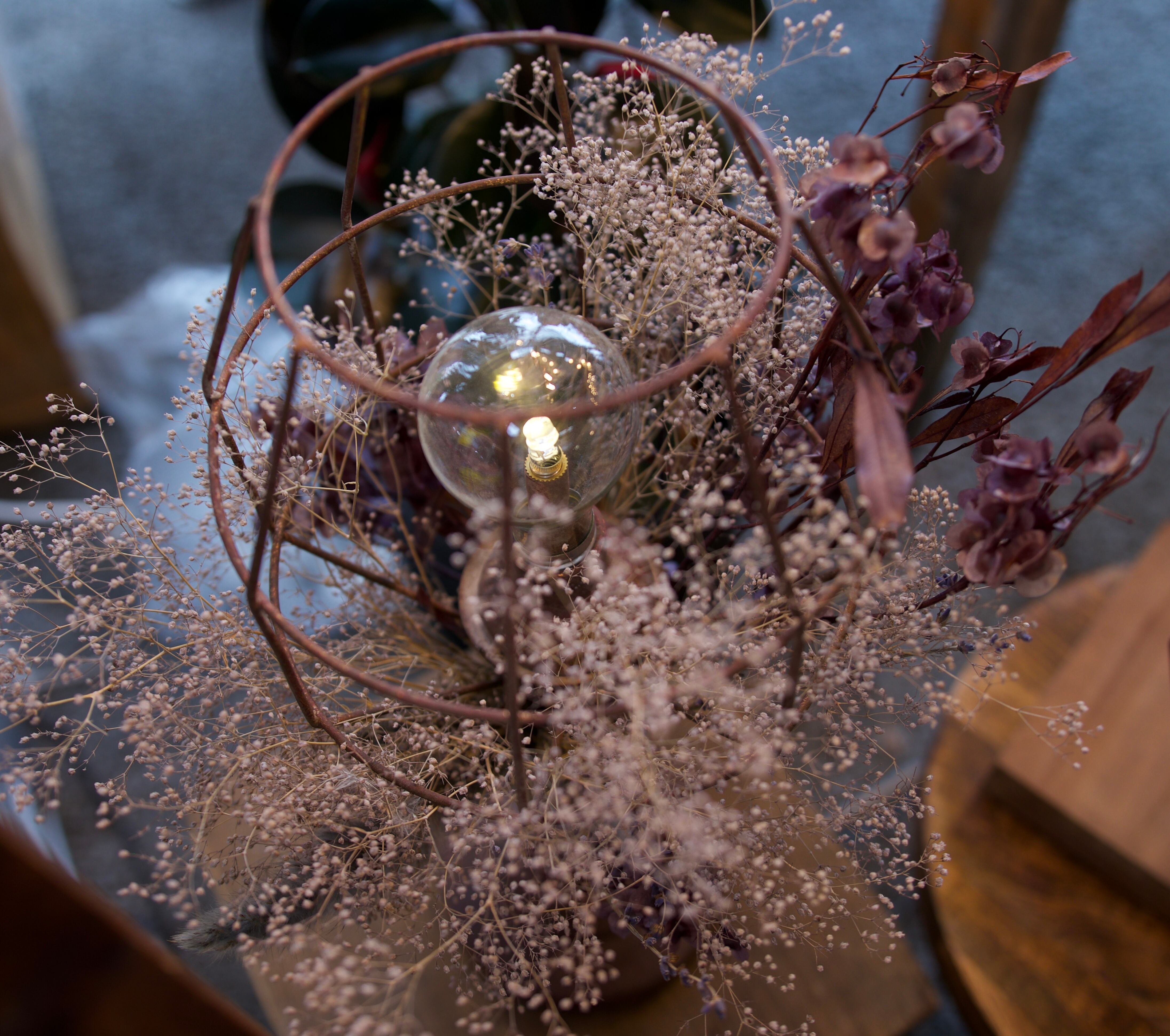 カスミソウやレーフファーンを組み合わせたバブル型の置き型ランプ。